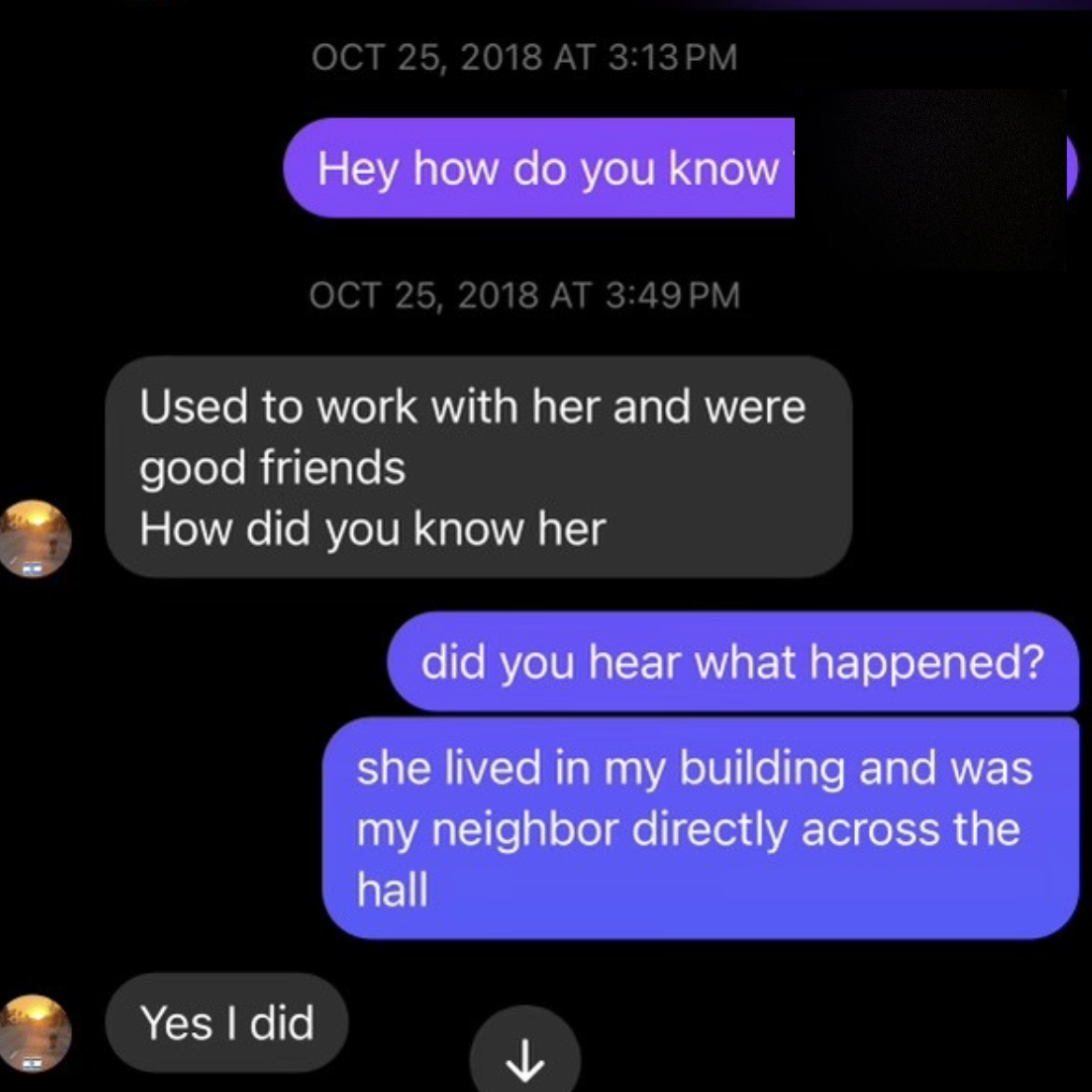 The next week, I came home from work on October 25th, a little early, and saw police cars, and the on site manager’s daughter in the lobby.